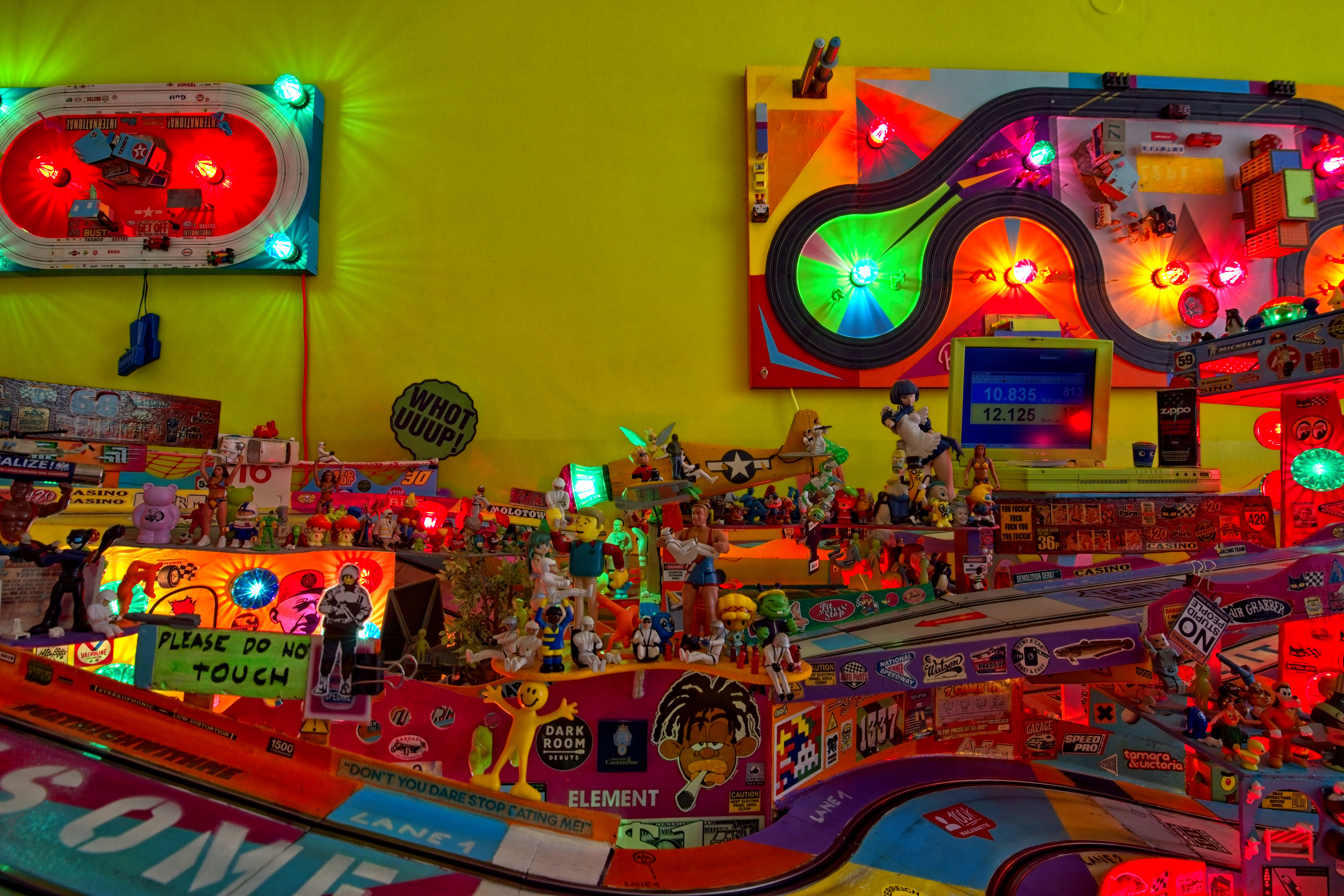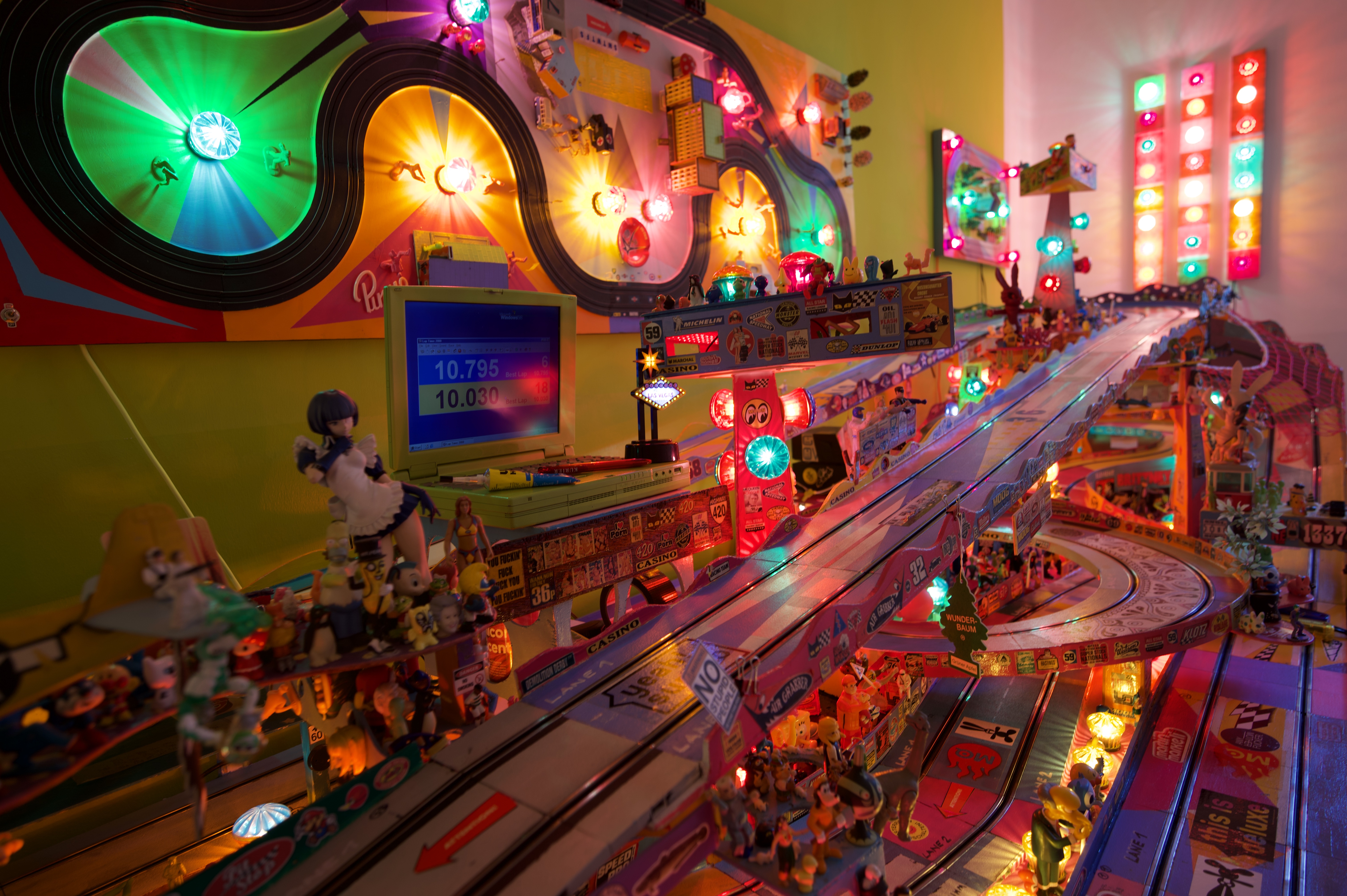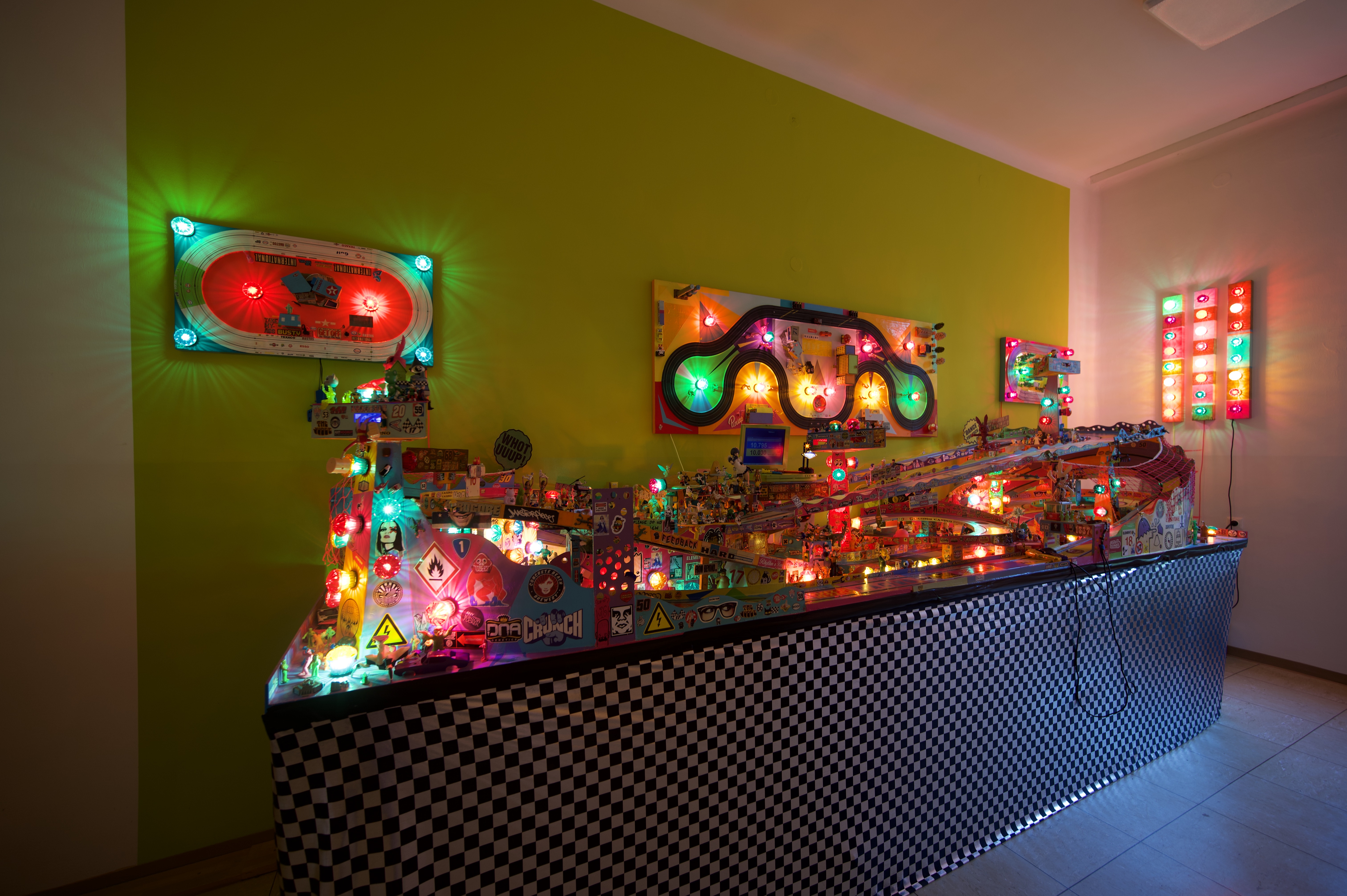 The artist is influenced by the time when the model car racing track found its way into the affluent society of the 1970s, the car as a status symbol for young and old. The racetrack serves as a projection surface for the perception of a society that is geared towards speed and competition. The artist takes up these aspects in his staging of objects. He presents them in a landscape with fast cars and various symbolic figures from the consumer world. The artistic engagement takes place with the scene or the arena of car races. Markeli's racecourse is an artifact with which the artist breaks his interpretation of the spectacle down to a scale of 1:32 and tries to stimulate all the senses of the viewer. The focus is on the interaction between the work of art and the audience, which is established through a playful approach. The object has been continuously developed and transformed since 2012, and the individual interactions are inscribed in the materiality of the track