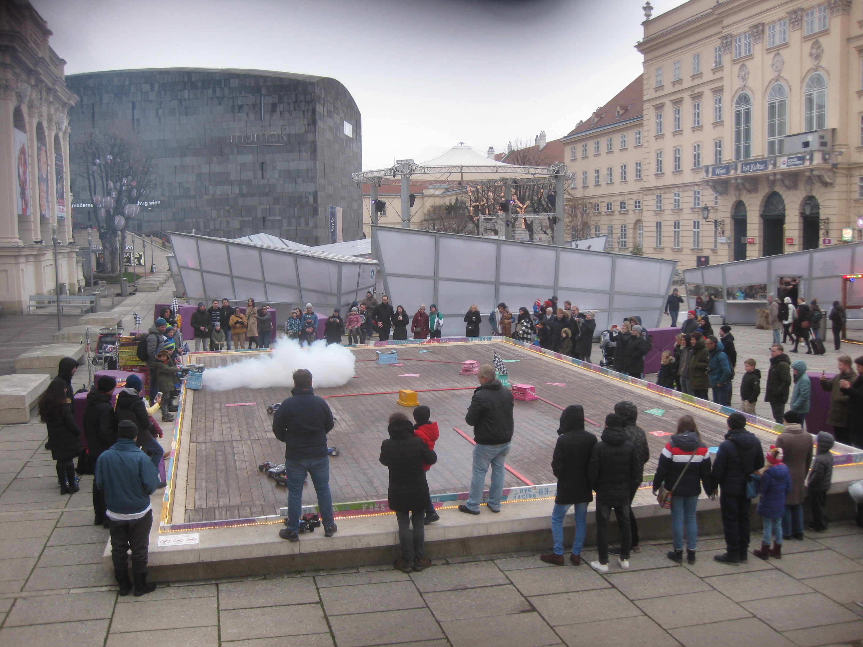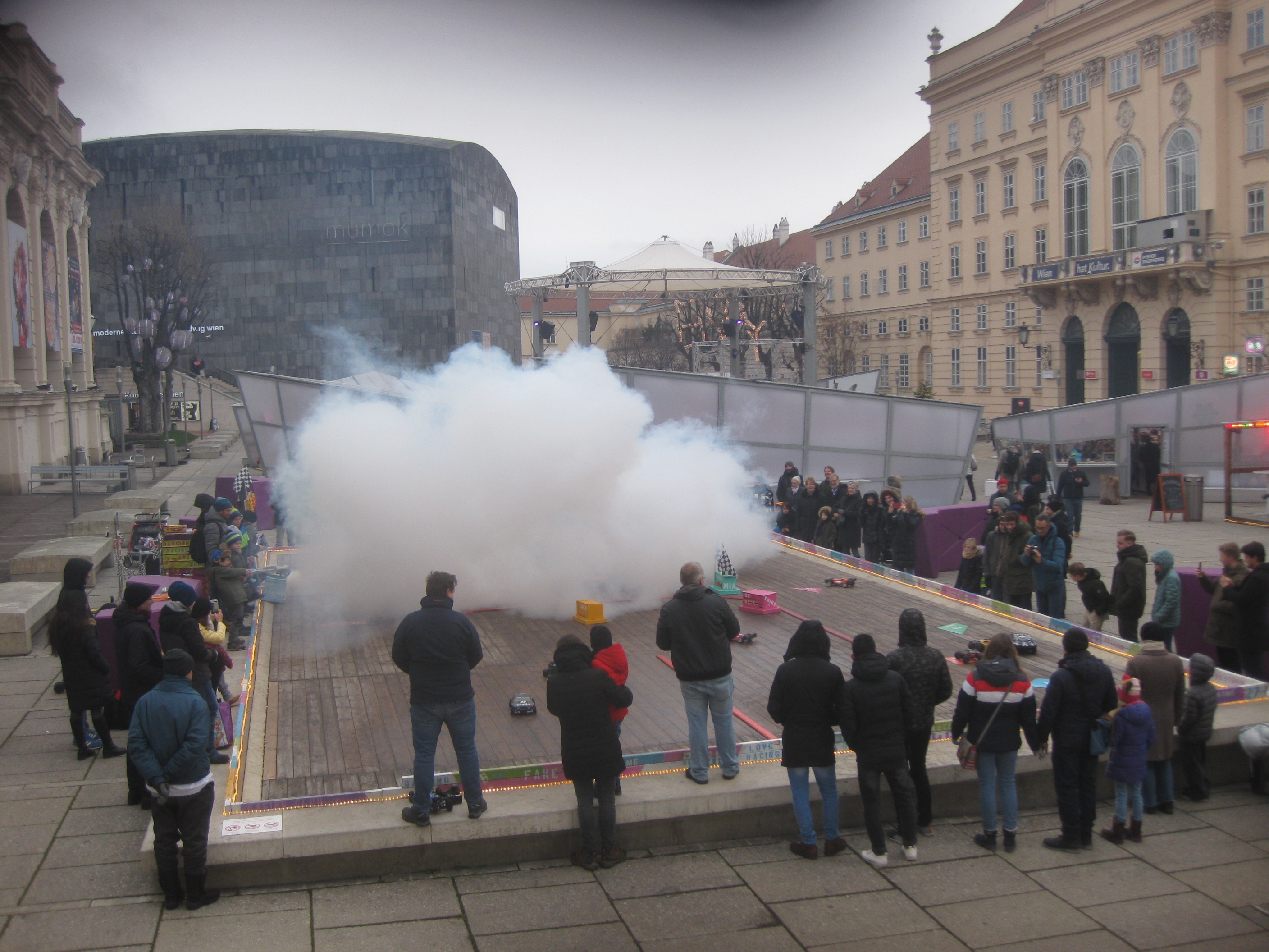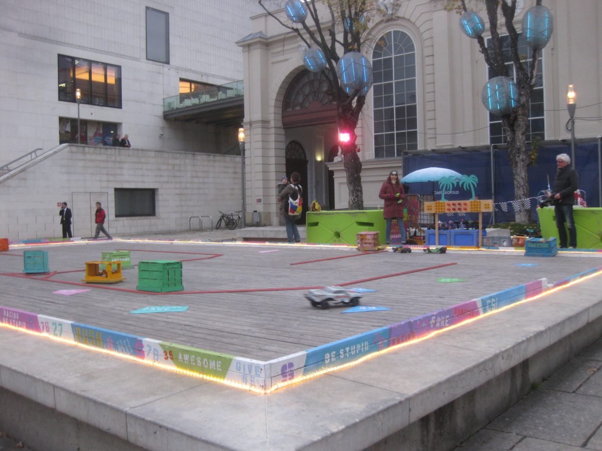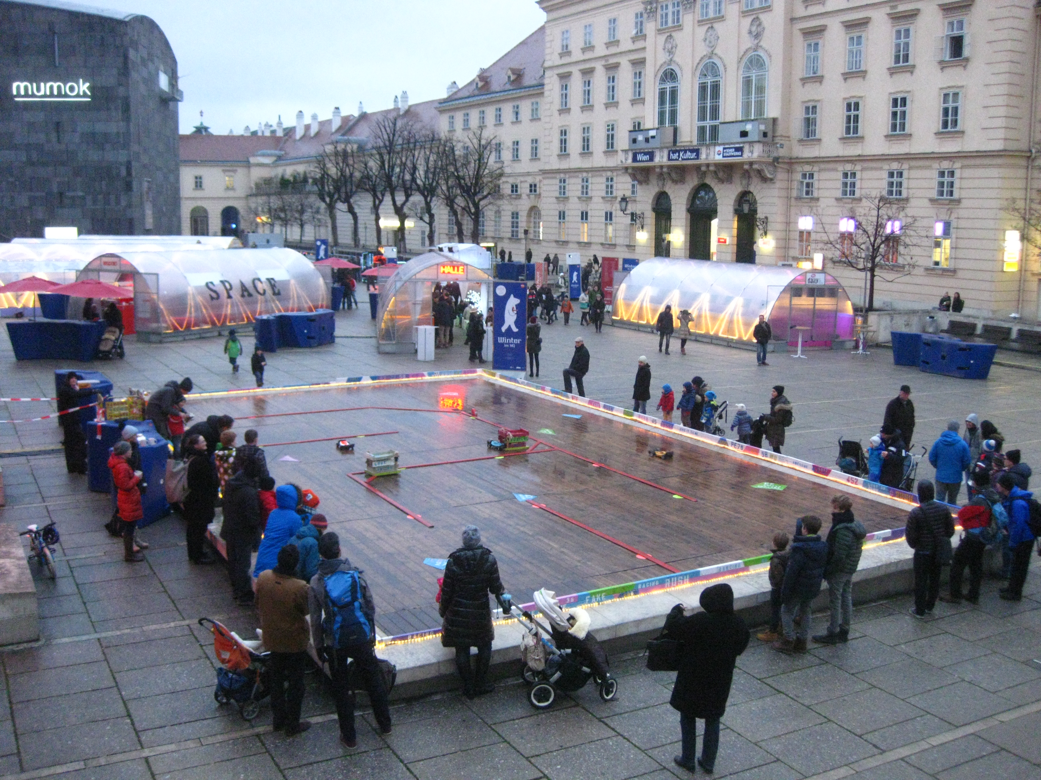 Since 2006, the light and installation artist Martin Markeli has turned the MQ water basin into an arena that visitors can explore with remote-controlled model cars. The Winter Race is a temporary installation by the artist that offers visitors the opportunity to “experience” the feeling of competition through a playful approach. The focus of the installation is the interplay between the “play objects” and the visitors, who together change the public space as part of the creative participation.