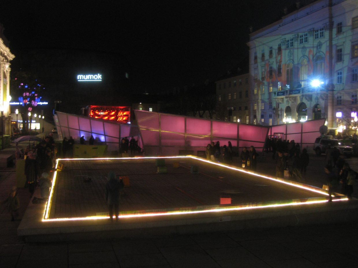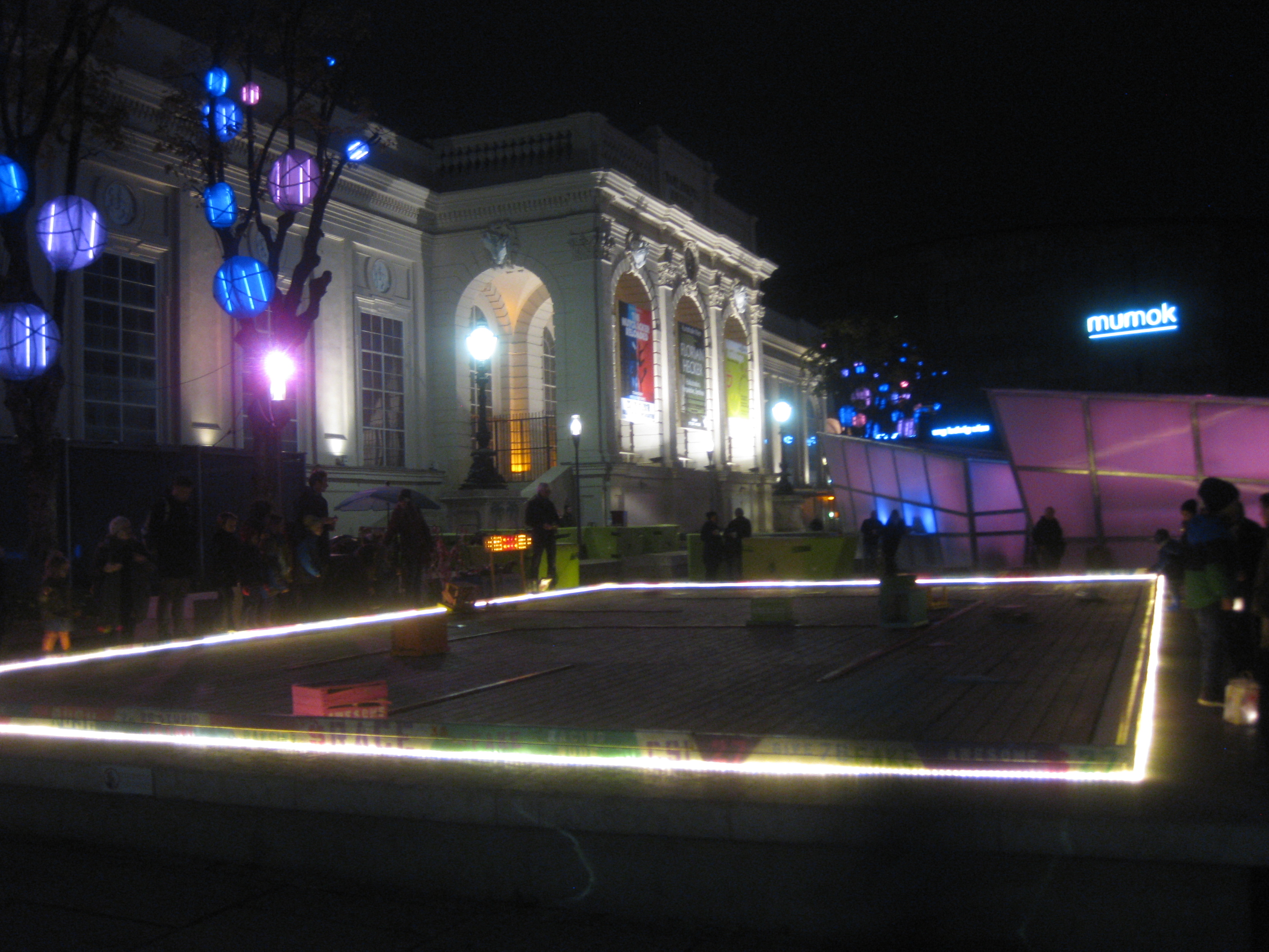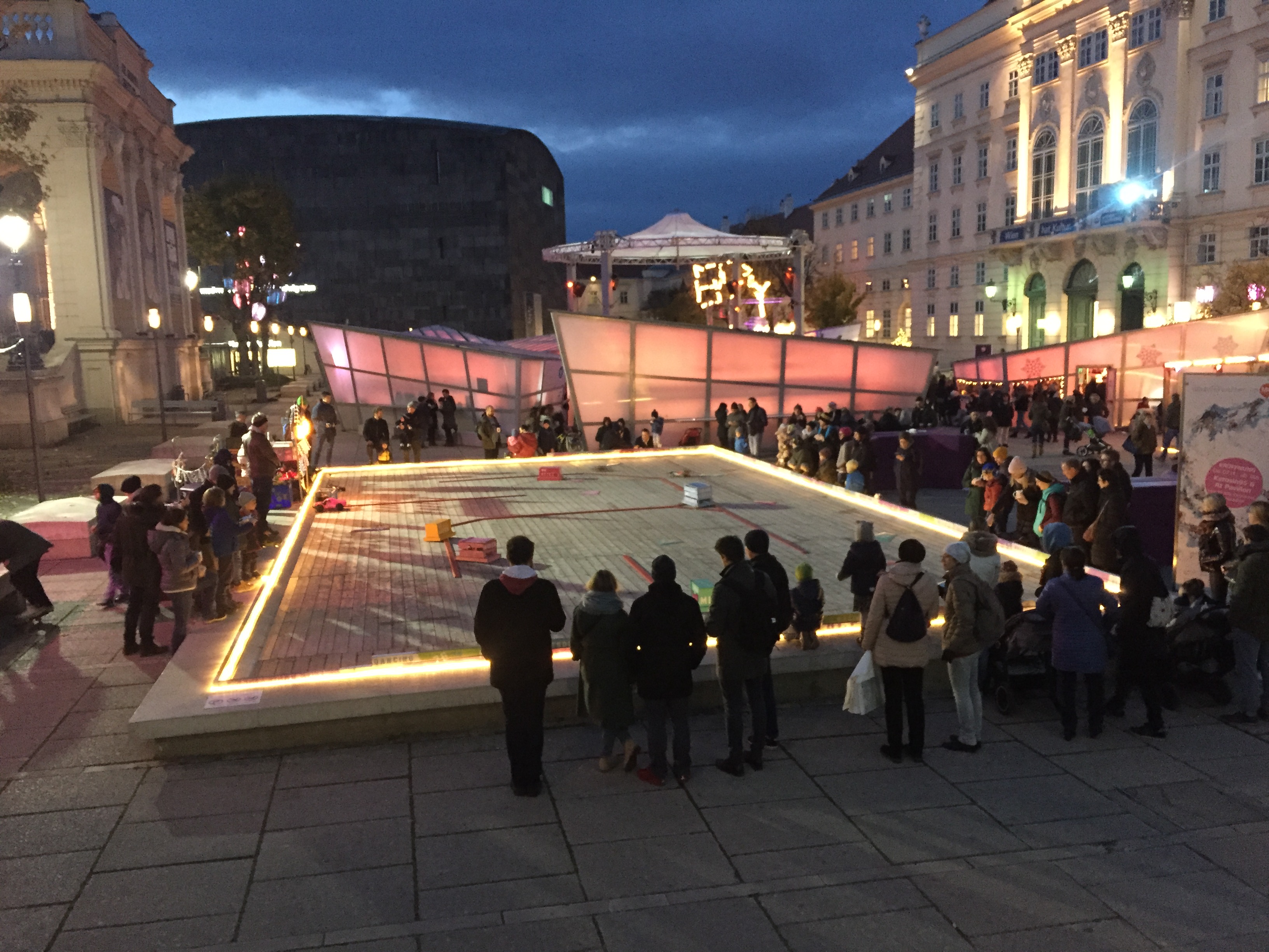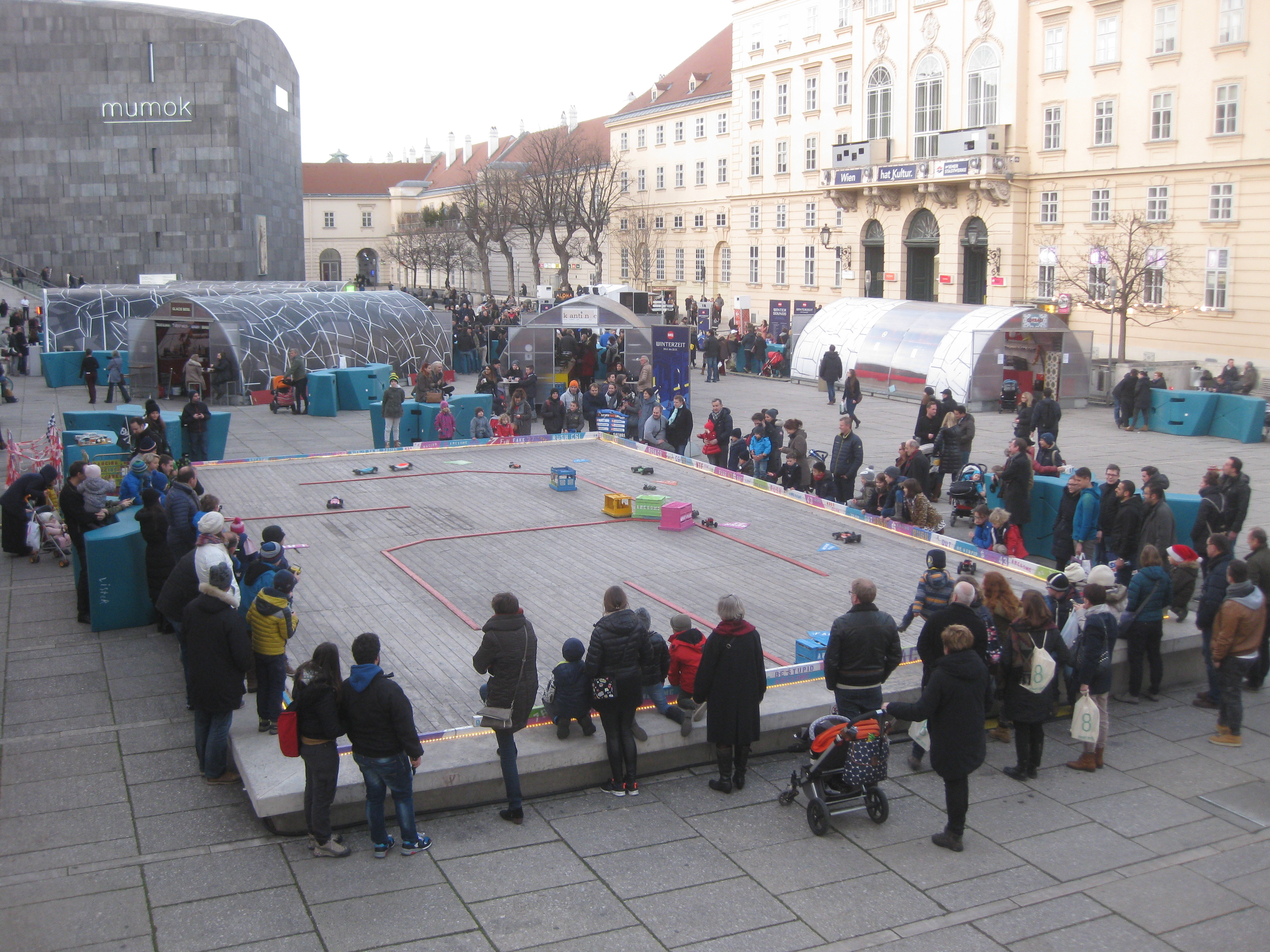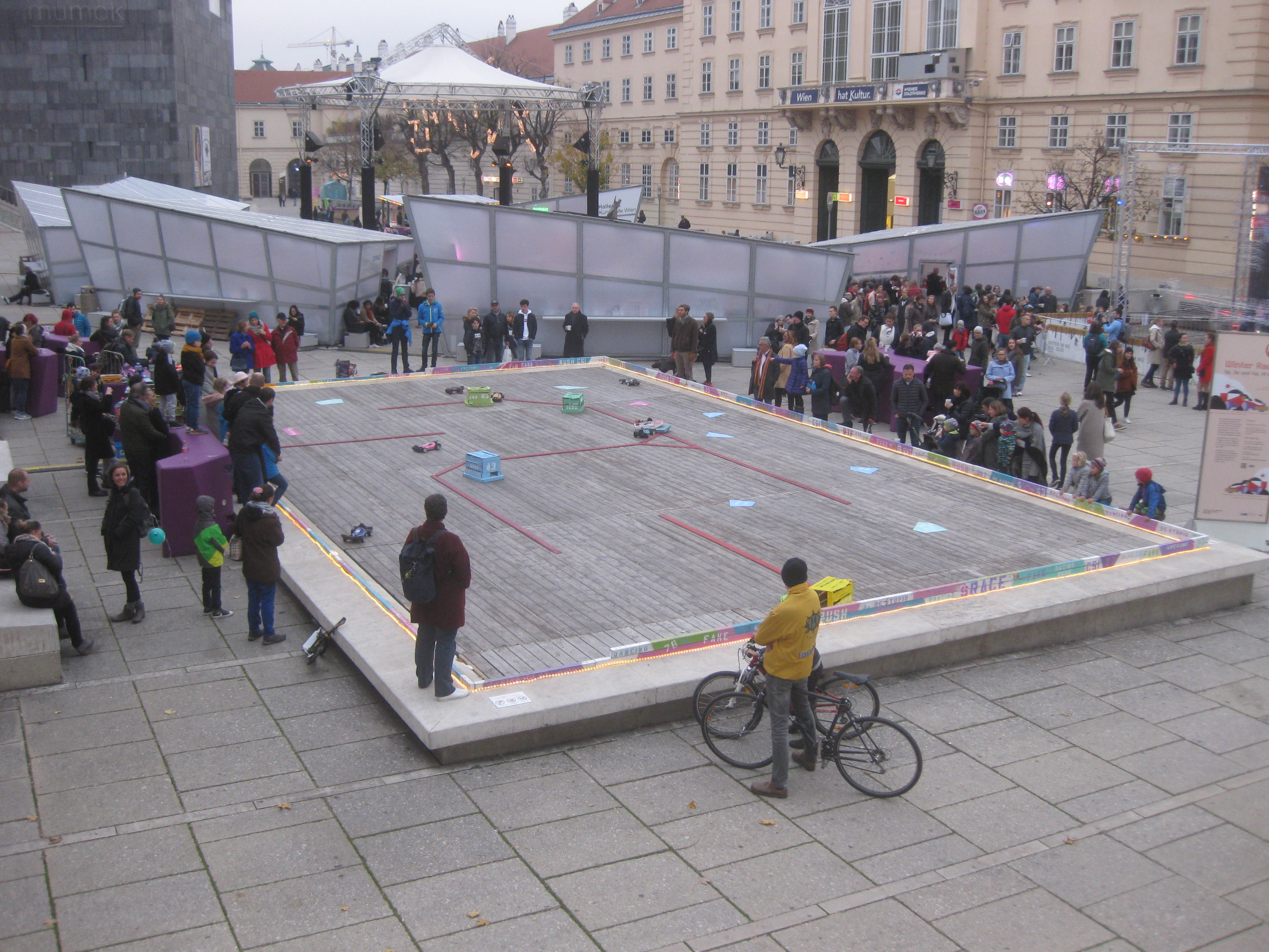 Since 2006, the light and installation artist Martin Markeli has turned the MQ water basin into an arena that visitors can explore with remote-controlled model cars. The Winter Race is a temporary installation by the artist that offers visitors the opportunity to “experience” the feeling of competition through a playful approach. The focus of the installation is the interplay between the “play objects” and the visitors, who together change the public space as part of the creative participation.