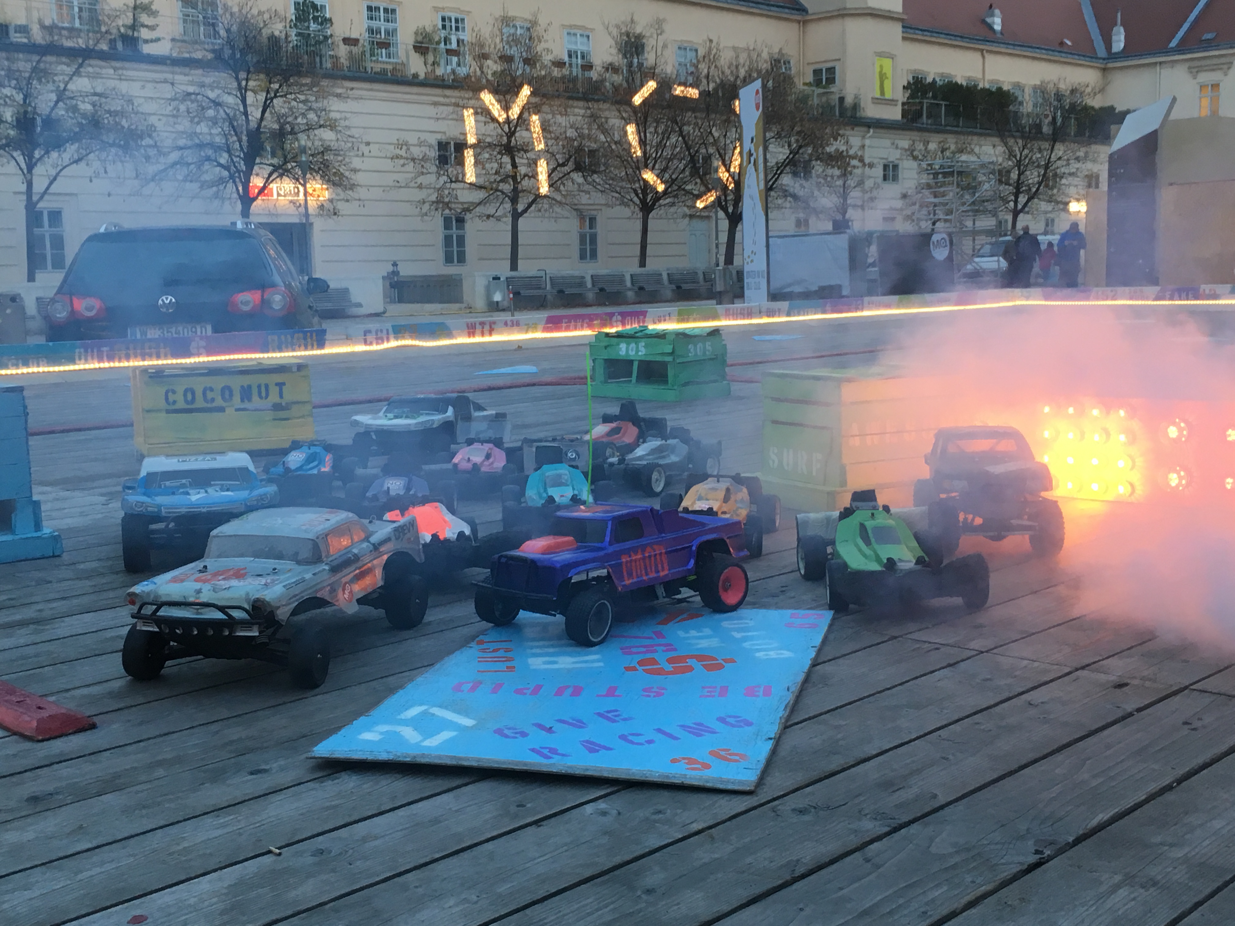 Seit 2006 inszeniert der Licht- und Installationskünstler Martin Markeli das MQ Wasserbecken zu einer Arena, die mit ferngesteuerten Modellautos von den Besucher*innen erkundet werden kann. Das Winter Race ist eine temporäre Installation des Künstlers, die den Besucher*innen die Gelegenheit bietet, über einen spielerischen Zugang das Gefühl des Wettbewerbs zu „er fahren“. Im Fokus der Installation steht das Zusammenspiel zwischen den „Spielobjekten“ und den Besucher*innen, die gemeinsam als Teil der kreativen Partizipation den öffentlichen Raum verändern.